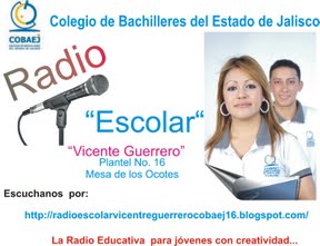Radio escolar “Vicente Guerrero” plantel No. 16 Mesa de los Ocotes del Colegio de Bachilleres del Estado de Jalisco, México te invitan a participar en la trasmisión Feria educativa COBAEJ 2011 con temas educativos, entrevistas, charlas, música y sobre todo la interactividad con alumnos con deseos de superarse.