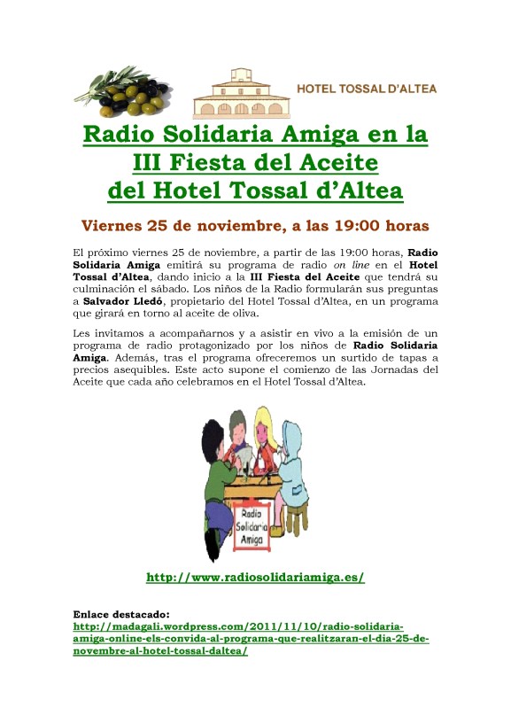 Sí, els xiquets de Ràdio Solidaria Amiga, online els conviden al programa que faran en el Hotel «Tossal D’Altea» el dia 25 de novembre a les 19:00.
