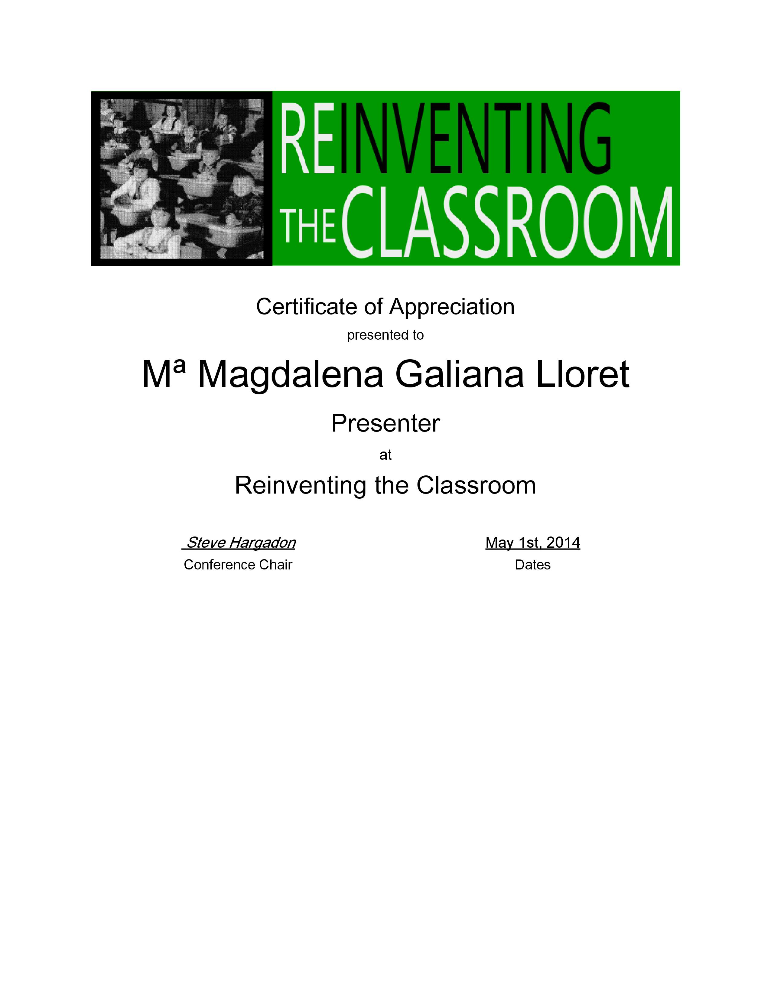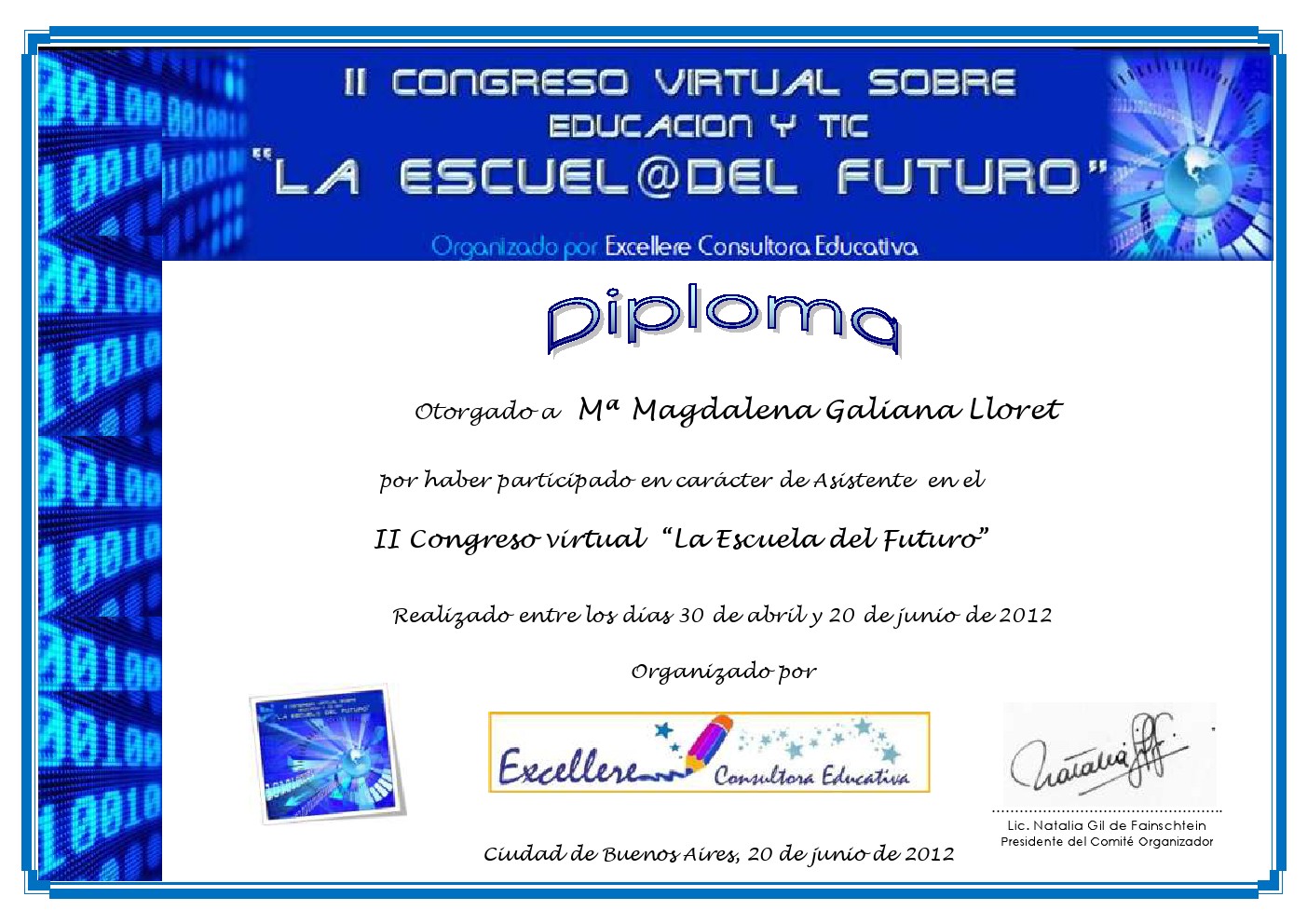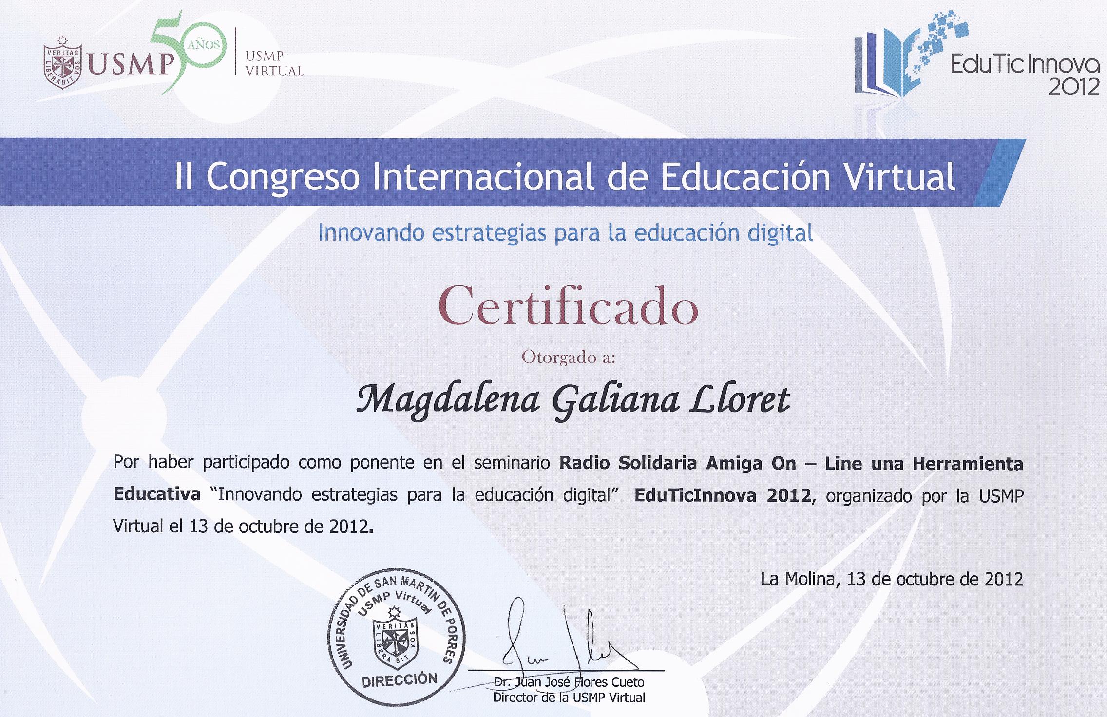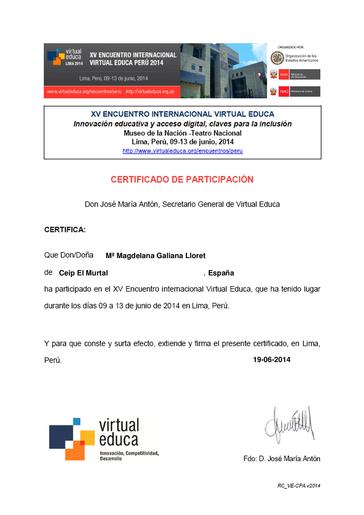Congreso Nacional “Internet en el Aula”. Barcelona, ​​Granada, Madrid, Santander. 2008 – V Congreso Internacional de Educación en Madrid (2010) – Congreso DIM- AULATICO. Barcelona (2010) –Congreso TECNONEET- Murcia (2010) .-Congreso K12 línea 2010- 7º Congreso Internacional sobre “Educación, Cultura y Desarrollo” – Málaga. 2011- Congreso: Global Education Conferencia-2010 en línea.-Conferencia Mundial de Educación – Línea 2011 – Conferencia Mundial de Educación – Online 2012 – IEARN-VI Encuentro Internacional Educared. 2011- VI Encuentro Internacional Educared. 2012-2013-Congreso CLED 2010-Congreso CLED 2011- II Congreso EduTicInnova 2012- USMP Lima-2012-II Congreso Virtual sobre Educación y TIC: LA ESCUELA DEL FUTURO 2012- Encuentro «Acción Magistral» Madrid 2012- ( http://vimeo.com/53933590 ) – Cumbre líderes de educación 2012- XIV Encuentro internacional Virtual Educa Colombia 2013-Conferencia Global de Educación Stemx 2013-OZeLive- febrero 2014-Congreso Innovagogía- Sevilla- España 2014-La revolución del aprendizaje- 2014Congreso Reinventando EL CLASSROOMO 201S-IV Congreso Virtual de Educación y TIC: La Escuela del Futuro 2014-XV Encuentro Internacional Virtual Educativo 2014- V CONGRESO INTERNACIONAL DE EDUCACIÓN VIRTUAL- EduTicInnova- 2015…etc
